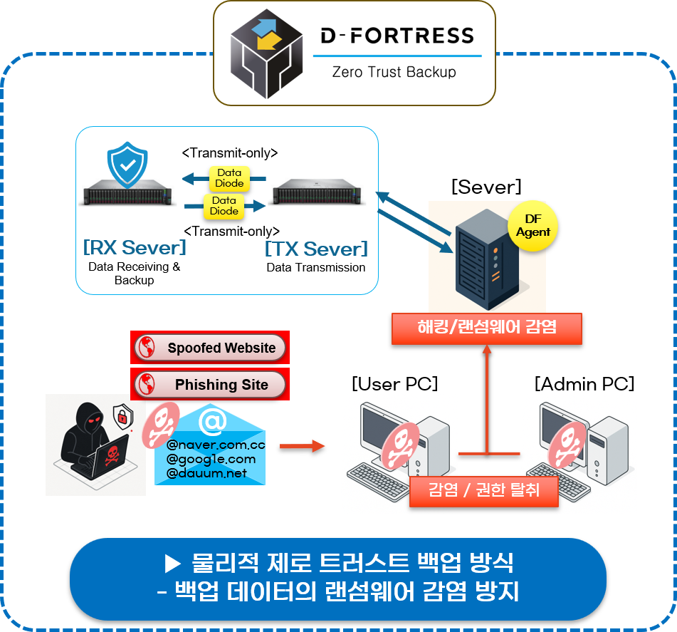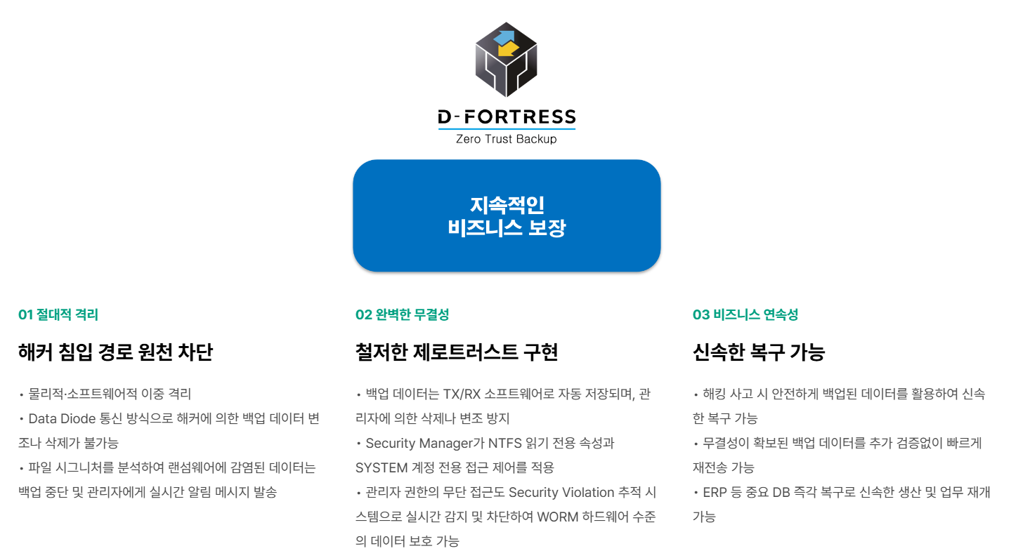 D-Fortress는 물리적 제로 트러스트를 구현한 백업 시스템으로서, 데이터 다이오드(Data Diode) 기술을 적용해 백업 서버와 운영망 사이의 통신을 물리적으로 단방향으로만 허용합니다.