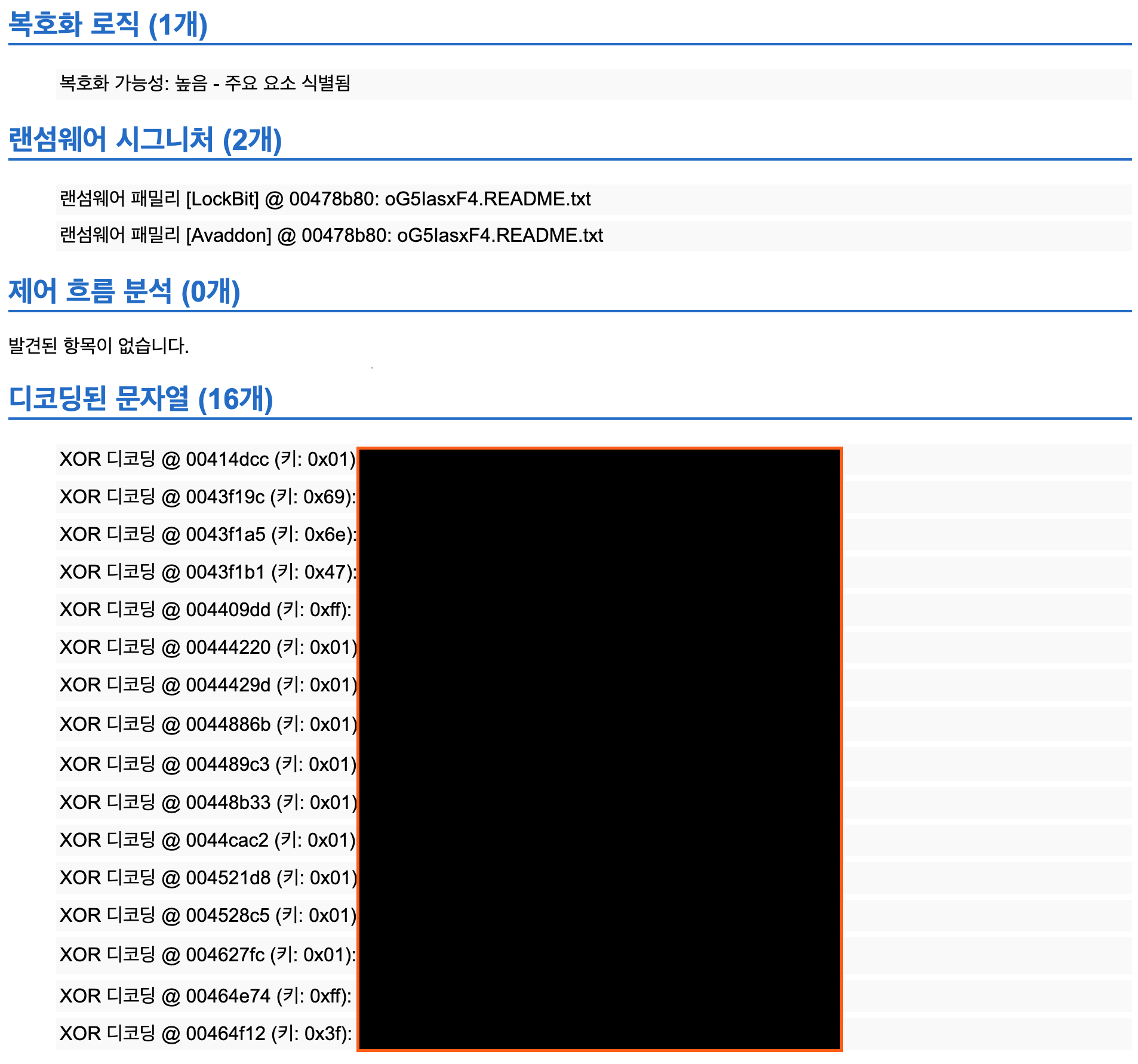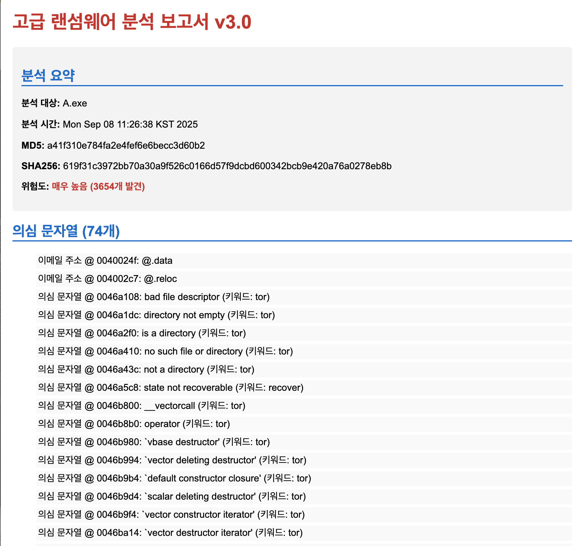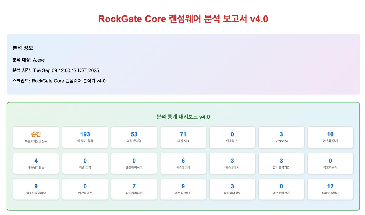 이 정보들은 HTML 형식의 리포트로 정리되어, 직관적이고 효율적인 분석을 가능하게 합니다. 단, 리버싱 리포트만으로는 복호화 툴 제작이 불가능하며, 메모리 포렌식, 동적 분석, 후킹 리포트가 모두 결합되어야 완전한 툴 제작 환경이 구축됩니다.