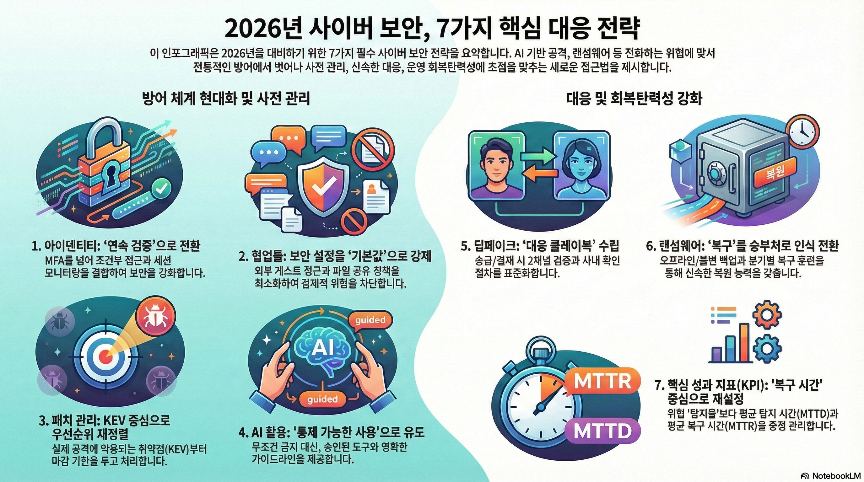 2026년 사이버 위협은 “새로운 해킹 기술”보다 AI가 만든 스케일(자동화·대량화)이 본질입니다. 공격자는 더 설득력 있게 사칭하고, 더 빠르게 취약점을 파고들며, 더 자연스럽게 협업툴까지 들어옵니다. 방어는 결국 아이덴티티·기본값 보안·KEV 중심 운영·복구 설계로 수렴합니다.